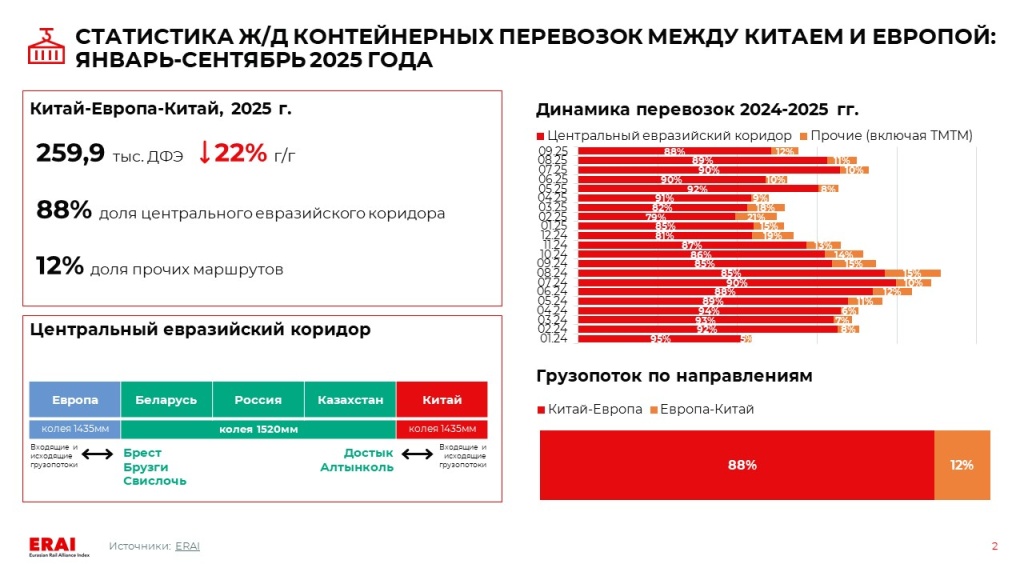 - За девять месяцев 2025 года железнодорожные контейнерные перевозки в России сократились на 5% г/г. Импорт через Дальний Восток упал на 14%, а транзит — на 12%, тогда как экспорт вырос благодаря отгрузкам промышленной продукции через сухопутные переходы [SeaNews]. По итогам года РЖД ожидают объем в 7,5 млн ДФЭ, что на 5% ниже показателя 2024 года, а прогноз на 2026 год корректирован в сторону умеренного роста [InfraNews].