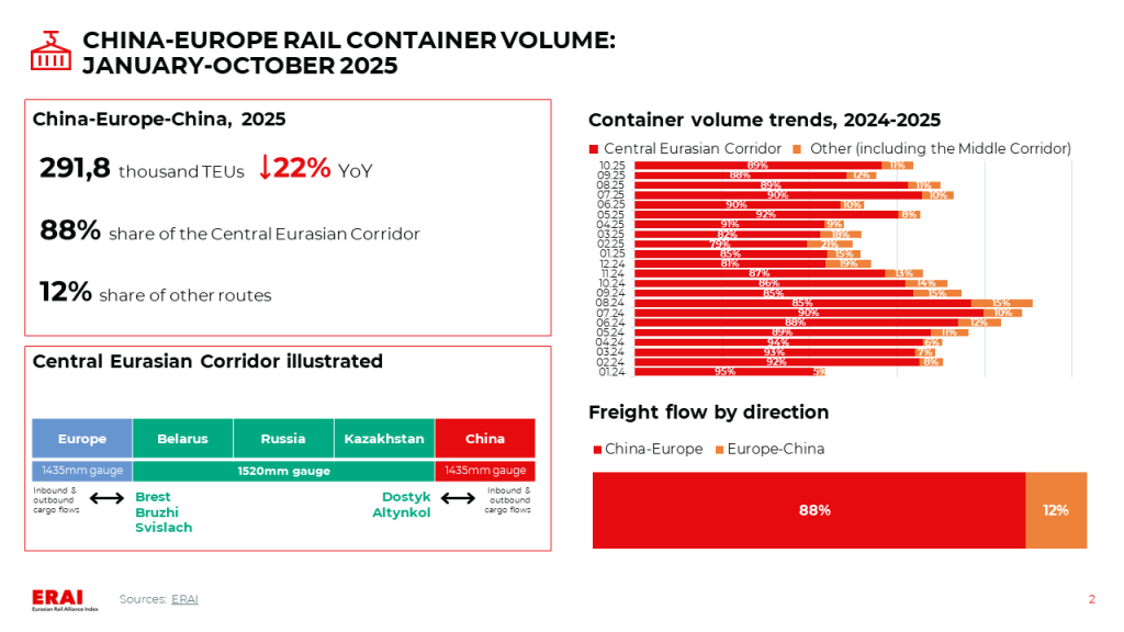 - In January-October, the volume of China-Europe-China rail container transportation decreased by 21% YoY. In October, the total shipment volume across all routes fell by 11% YoY but also increased by 11% MoM. Volume growth in October compared to September was recorded on both the Central Eurasian Corridor and the Middle corridor. Seasonal delays are observed on the Middle corridor in the Caspian Sea due to adverse weather conditions.