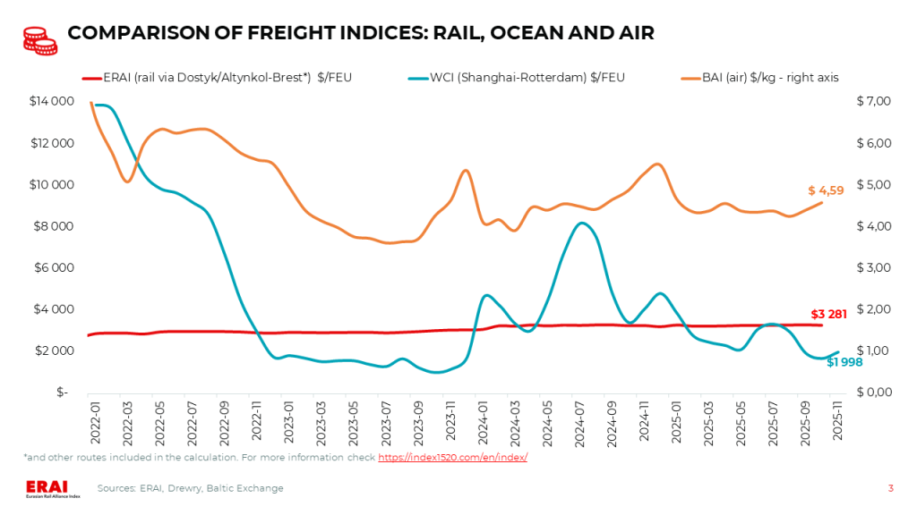 - Demand for Asia-Europe ocean freight remains stable. According to JOC, in 4Q2025 demand may receive additional support from inventory replenishment ahead of the late Chinese New Year (17.02.2026-03.03.2026). A new trend on the demand side is that shippers have begun reallocating bookings in favor of services with shorter transit times [Flexport].