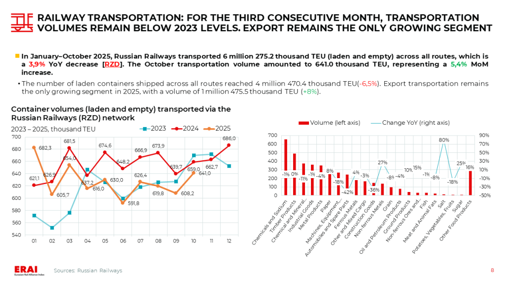 - In January—October 2025, Russian Railways transported 6 million 275.2 thousand TEU (laden and empty) across all routes, which is a 3,9% YoY decrease [RZD]. The October transportation volume amounted to 641.0 thousand TEU, representing a 5,4% MoM increase. Export transportation remains the only growing segment in 2025, with a volume of 1 million 475.5 thousand TEU (+8% YoY).