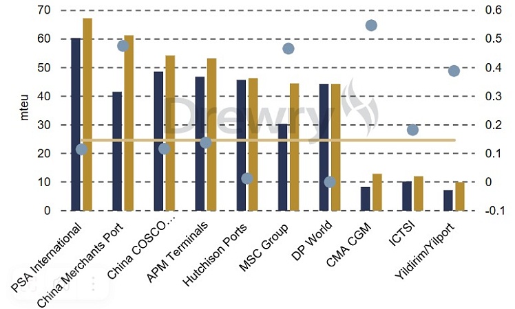 Терминальные подразделения ряда ведущих мировых судоходных линий, таких как MSC Group (TiL и AGL), CMA CGM (CMA Terminals и Terminal Link) и, совсем недавно, Hapag-Lloyd (Hanseatic Global Terminals), которых Drewry обозначила как гибридных операторов терминалов, укрепили свои позиции в рейтингах компании. Эти бизнес-единицы, на 100% или в основном принадлежащие указанным контейнерным перевозчикам, в основном работают на терминалах на тех же коммерческих условиях, что и ведущие независимые операторы (PSA International, China Merchants, DP World, Hutchison Ports), но лучше гарантируют объемы благодаря совпадению собственности.