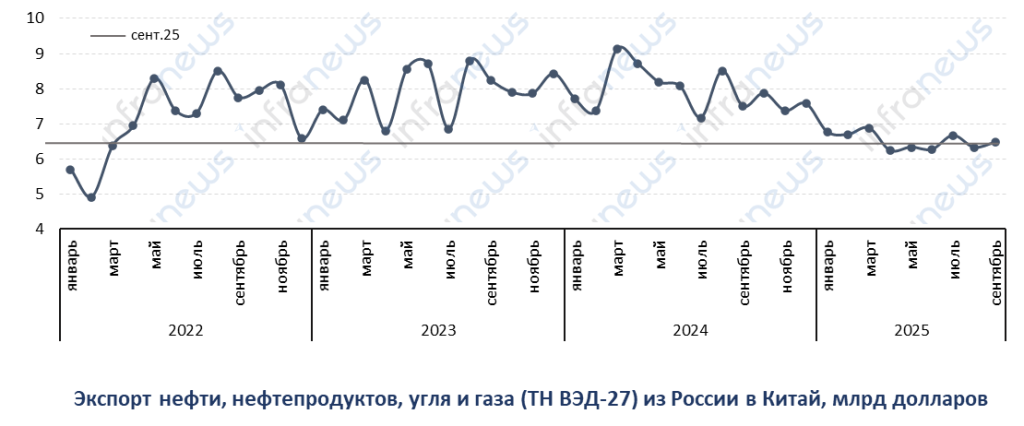 В структуре экспорта стоимость поставок нефти, угля, нефтепродуктов и газа за январь-сентябрь составила почти 59 млрд долларов, что на 18,9% или на 14 млрд долларов меньше, чем годом ранее. В сентябре поставки этой номенклатурной группы в Китай остались на среднем уровне текущего года — 6,5 млрд долларов против среднемесячного уровня 8 млрд долларов в прошлом году.