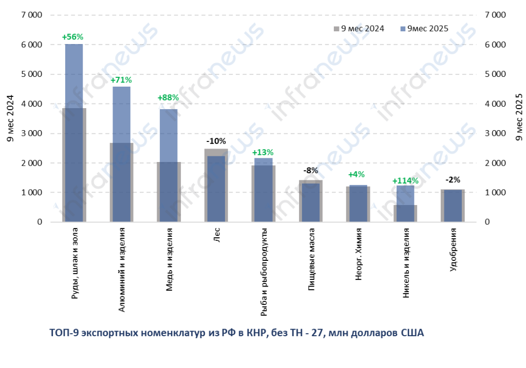 Вместе с этим, растет экспорт российской руды и металлов в Китай. Так, с начала года экспорт никеля увеличился больше, чем в 2 раза, меди — на 88%; экспорт различных металлических руд и алюминия увеличился более чем в 1,5 раза.