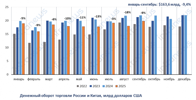 Темпы спада относительно уровня прошлого года замедлились с 18% в августе, а месяц к месяцу оборот вырос на 10%. В прошлом году товарооборот России и Китая с августа по декабрь находился на высоком уровне в среднем 21,6 млрд долларов по итогам месяца.
