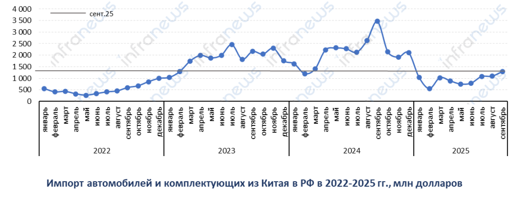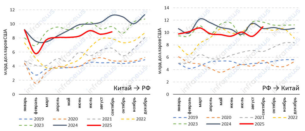 Импорт китайских товаров в Россию в сентябре составил 8,9 млрд долларов, что больше, чем в августе на 4%. Тем не менее, спад относительно уровня прошлого года неизбежно ускорился до 21% в сентябре, что обусловлено высокой базой, так как в сентябре и декабре 2024 года объемы импорта были рекордными: 11,2 млрд и 11,3 млрд долларов соответственно.