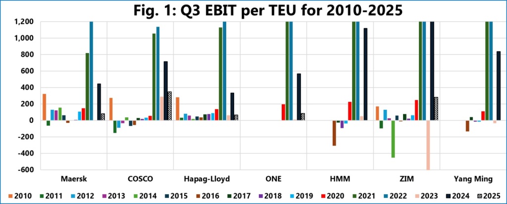 Совокупная операционная прибыль крупнейших мировых контейнерных перевозчиков в третьем квартале 2025 года сократилась до $5,12 млрд против $17,06 млрд годом ранее, следует из отчета Sea-Intelligence (issue 742). Несмотря на спад, показатель остается выше уровня 2019 года, что указывает на стабилизацию рынка после экстремальных результатов 2024 года.